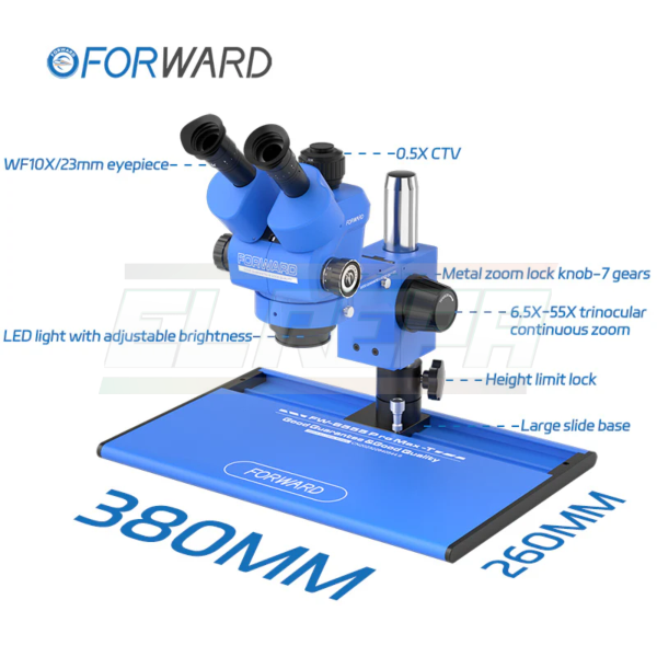 El Forward FW-6555 Pro Max-T representa un salto de calidad y funcionalidad frente a la mayoría de los modelos del mercado. Diseñado para ofrecer máxima comodidad, precisión y durabilidad, este microscopio trinocular se convierte en la herramienta ideal para profesionales exigentes. Características destacadas: - Zoom variable de 6,5x a 55x: Amplio rango de aumento que supera el promedio, ideal para trabajos de inspección detallada. - 7 puntos preestablecidos de zoom con bloqueo: Evitá movimientos involuntarios y mantené el enfoque preciso en cada ajuste. - Gomas oculares con sistema anti-luz y anti-aire: Aseguran un aislamiento eficaz del entorno, protegiendo la vista del usuario. - Base deslizante única en el mercado: Permite mover el microscopio a un costado fácilmente cuando no está en uso, liberando espacio y mejorando la ergonomía de trabajo. - Iluminación LED profesional (144 LEDs): Incluye aro de luz con regulador de intensidad (dimmer), brindando una iluminación potente y uniforme. - Trinocular con adaptador de cámara 0,5x: Ideal para conectar cámaras digitales o industriales, con ajuste de foco incluido. - Lente de protección 1x: Resguarda contra polvo y humo durante el trabajo. Contenido del paquete: - Microscopio Trinocular Forward FW-6555 Pro Max-T - Base deslizante con brazo enfocador - 2 oculares de 10x / 23 mm (campo de visión superior al estándar) - Aro de luz de 144 LEDs con dimmer - Adaptador de cámara 0,5x con regulación de foco - Lente protector 1x contra polvo y humo - Gomas para oculares sistema “New System” - Anillo limitador de enfoque - Funda protectora - Juego completo de herramientas para armado